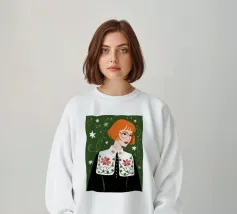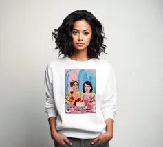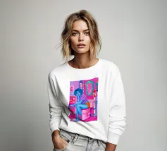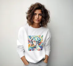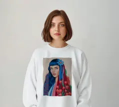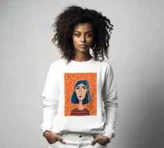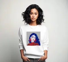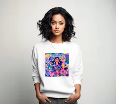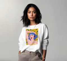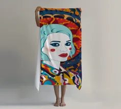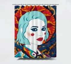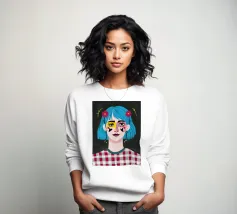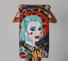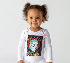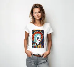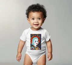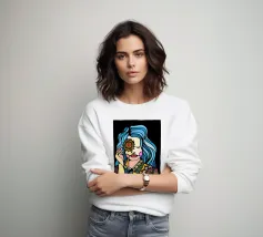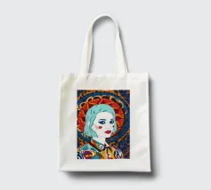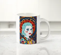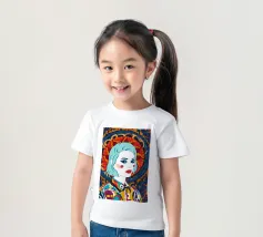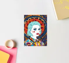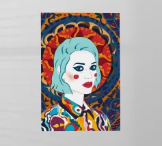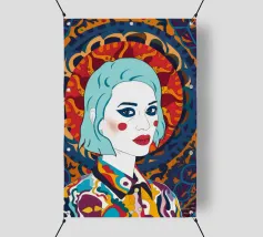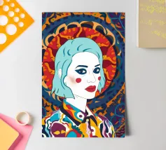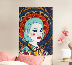Questa opera d'arte mostra una figura con capelli blu circondata da intricati motivi caleidoscopici dai colori intensi. Lo sfondo è pieno di forme geometriche e disegni vivaci.
