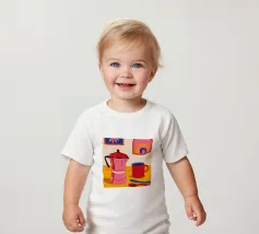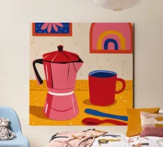 Un'audace illustrazione grafica di una caffettiera rossa e di una tazza rossa abbinata, ambientata in uno spazio cucina minimalista con un accento arcobaleno, che celebra il rito del caffè.