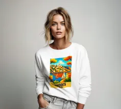 Con l'emblematica statua del cervo, le pareti ocra e il cielo blu brillante, questo poster cattura l'essenza di Rodi. Una città tra l'antichità e il Mediterraneo, presentata qui in uno stile solare e retrò. Un tocco di storia da appendere a casa vostra.