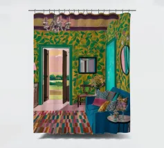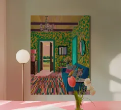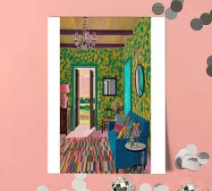 Una stanza elegantemente decorata con un tappeto a motivi, una grande pianta, uno specchio circolare verde acqua e un lampadario di cristallo, che si affaccia attraverso un arco su un'altra stanza.