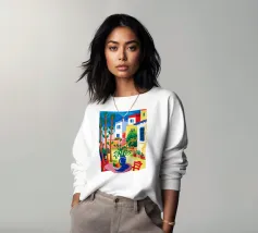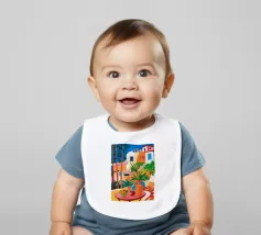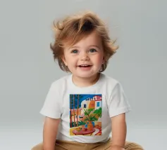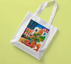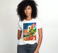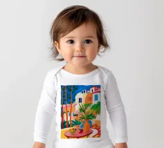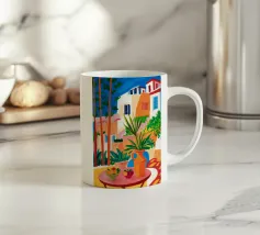 Una splendida natura morta di frutta fresca e bevande su un tavolo apparecchiato su un balcone, con una vista pittoresca di una classica città di mare del Mediterraneo. La scena è una fuga idilliaca e vibrante, che cattura perfettamente l'essenza di una vacanza sulla costa.