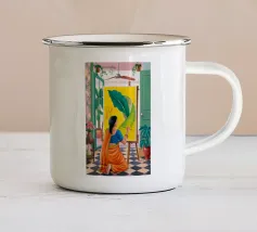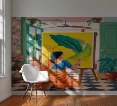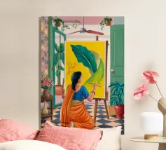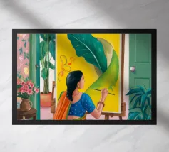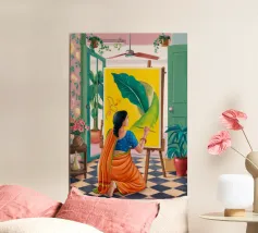 Una donna con un vivace sari verde e giallo si trova con grazia in una stanza con carta da parati a motivi e una porta che conduce a un giardino lussureggiante e illuminato dal sole, incarnando l'eleganza e il legame con la natura.