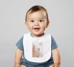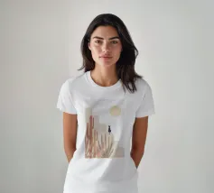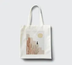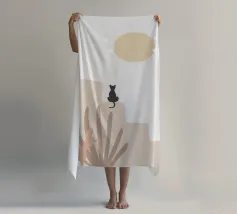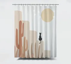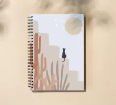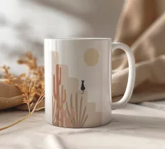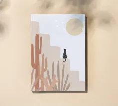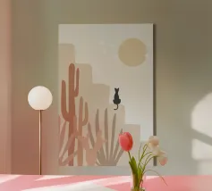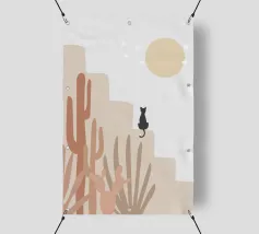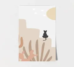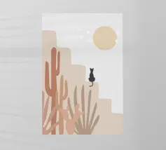 Illustrazione minimalista di un sereno paesaggio desertico con formazioni rocciose beige, cactus e piante del deserto in primo piano. Un gatto nero siede su una roccia sotto un grande sole o una luna giallo pallido, con stelle che punteggiano il cielo. Ideale per decorazioni a tema naturalistico e per gli amanti dell'arte stravagante.