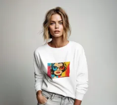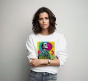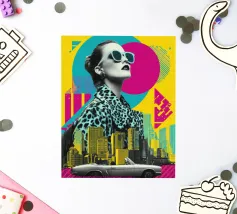 Una vibrante composizione pop art che fonde moda, architettura e atteggiamento. Una donna con un cappotto leopardato e occhiali da sole futuristici si erge al di sopra di uno skyline cittadino luminoso, mentre una classica decappottabile argentata aggiunge un tocco cinematografico. I colori esplosivi di giallo, ciano e magenta catturano l'impulso del moderno glamour urbano.