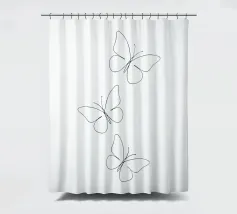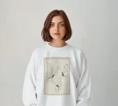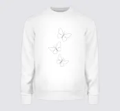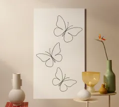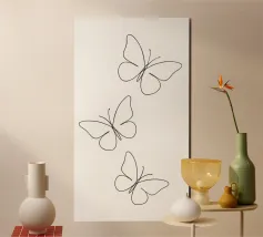 Tre farfalle si muovono in diagonale sulla superficie. Ciascuna farfalla è disegnata come un contorno fine e chiuso; ali, corpo e antenne sono indicati con una linearità ridotta, senza motivi o aree di riempimento. I diversi orientamenti delle farfalle creano un leggero movimento verso l'alto, mentre l'ampio spazio bianco isola chiaramente le forme.