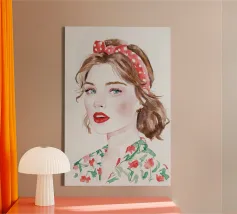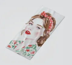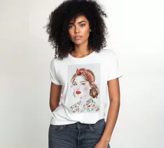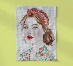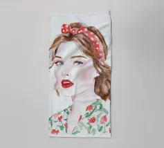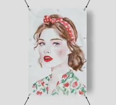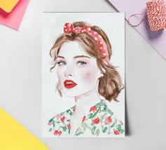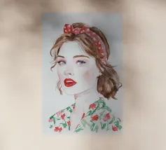 Ritratto ad acquerello fresco ed espressivo di una giovane donna dai capelli castano-rossicci legati all'indietro con un foulard a fantasia, che indossa un delicato top floreale, con uno sguardo dolce e diretto.