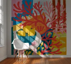 Una vivace natura morta con una ciotola blu di limoni su uno sfondo energico di fogliame rosso, simile al corallo, e rami bianchi, che crea una combinazione unica e surreale di mare e terra.