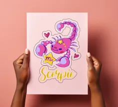 Una simpatica e colorata illustrazione del segno zodiacale dello Scorpione. Questo scorpione dall'aspetto giocoso, con dettagli a forma di cuori e stelle, rappresenta lo spirito intenso e affascinante dello Scorpione. Ideale per gli amanti dell'astrologia che desiderano aggiungere un tocco vivace e divertente al proprio spazio.