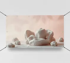 Diverse sculture in argilla bianca sono abilmente posizionate su una superficie bianca e pulita, impreziosita da uno sfondo rosa tenue. Questo cattura l'essenza dell'espressione artistica.