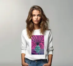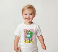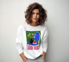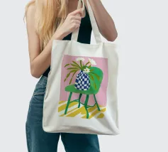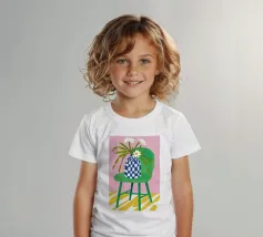 Una stravagante natura morta con un vaso di fiori bianchi e rosa appoggiato sul sedile di una sedia a scacchi bianchi e verdi. La composizione su uno sfondo rosa è giocosa, moderna e piena di fascino e stile grafico.