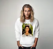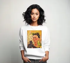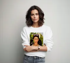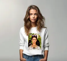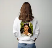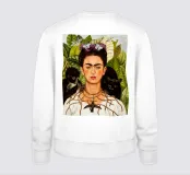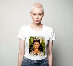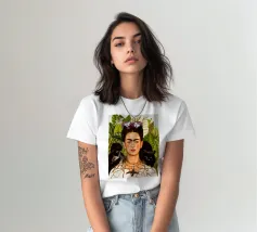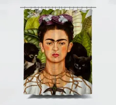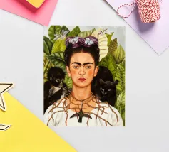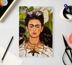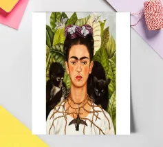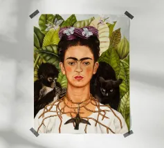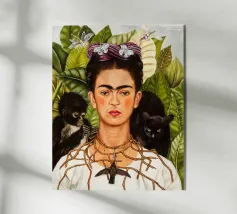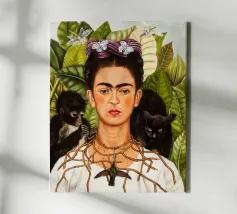 Autoritratto con collana di spine e colibrì (1940) di Frida Kahlo è un autoritratto suggestivo e simbolico che esprime resilienza, dolore e identità. Kahlo guarda direttamente lo spettatore, la sua espressione calma contrasta con la collana di spine che le trafigge la pelle. Alle sue spalle compaiono una scimmietta nera e un gatto nero, mentre un delicato colibrì le pende come un ciondolo alla gola. Circondato da foglie rigogliose e fiori bianchi, il ritratto fonde emozioni personali, simbolismo culturale e immagini della natura. Il dipinto trasmette i temi della resistenza, dell'autoconsapevolezza e della forza interiore, rendendo il ritratto un'opera di grande valore.