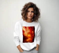 Una baita scarsamente illuminata si trova in una foresta al crepuscolo, circondata da un'atmosfera nebbiosa. Il bagliore di una lanterna proietta una luce calda sulla veranda, mettendo in risalto le foglie cadute.