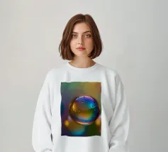 Una sfera trasparente poggia tranquillamente su una superficie bianca e pulita, catturando la luce intorno a sé. La sua forma liscia e cristallina riflette le luci soffuse e rivela le ombre sottili sottostanti, creando un senso di purezza e semplicità. La sfera sembra quasi priva di peso, come una goccia di luce congelata in uno spazio perfettamente calmo.