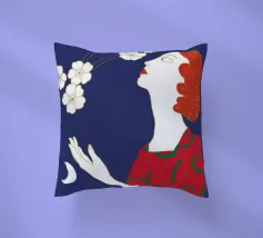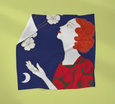 Una donna in abito rosso, vista da dietro, guarda la luna crescente e il cielo notturno pieno di fiori bianchi, creando una scena magica e contemplativa.
