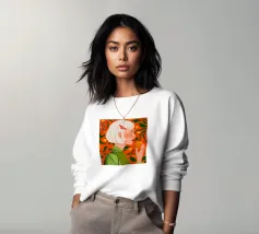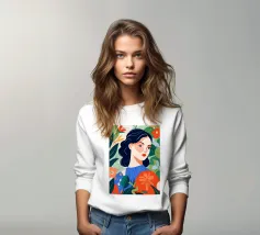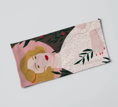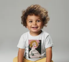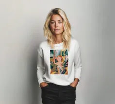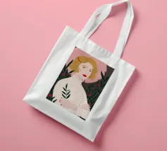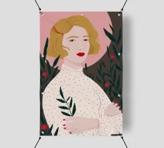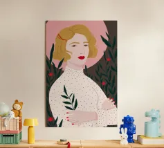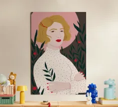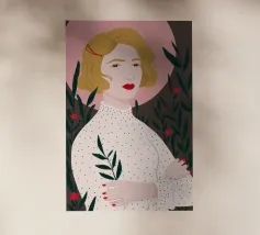 Ritratto di una donna pensierosa dai capelli biondi, le cui forme si intrecciano con un ramo delicato e frondoso, su uno sfondo rosa tenue, creando una composizione dolce e poetica.