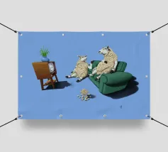 Illustrazione comica di un commento socio-politico sul modo in cui gli esseri umani sono dipendenti dalla televisione e la seguono quasi come pecore.