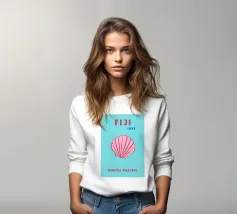 Conchiglia rosa con cornice decorativa su sfondo verde con il testo Shell yeah! Per tutti gli amanti della spiaggia!