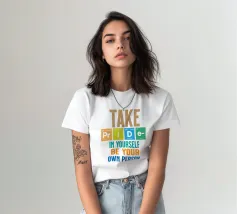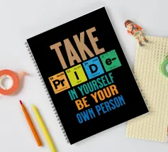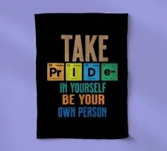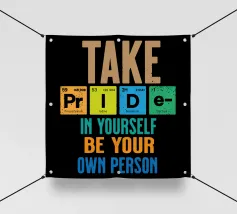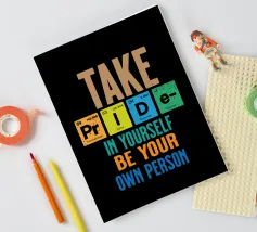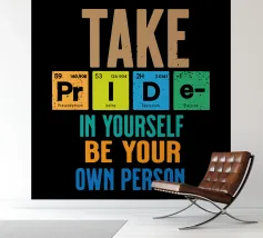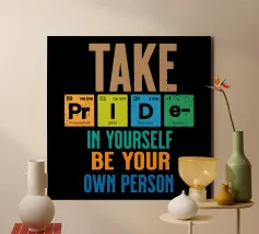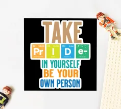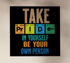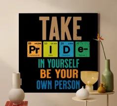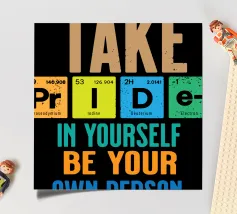 Questo design accattivante presenta gli elementi della tavola periodica su uno sfondo di testo "PRIDE", creando una dichiarazione di vita motivazionale e un messaggio positivo rilevante: "Sii orgoglioso di te stesso". Sii te stesso".