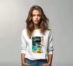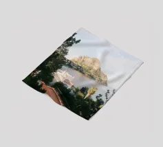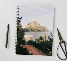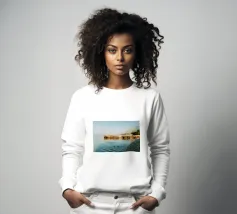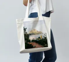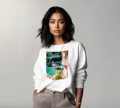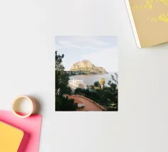 Una grande collina o montagna rocciosa si erge maestosa sullo sfondo, aggiungendo un tocco drammatico al paesaggio sereno. Il corpo idrico, probabilmente un mare o un lago, scintilla tra il villaggio e la collina, creando una scena pittoresca e tranquilla che fonde magnificamente la bellezza naturale con gli elementi architettonici.