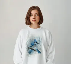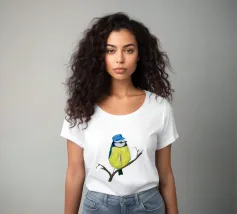 L'uccellino è seduto su un ramo inclinato e sembra posare con orgoglio. Indossa un berretto blu in stile militare. Le proporzioni dell'uccellino sono state leggermente modificate per renderlo più carino.