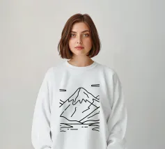Un'audace e intricata illustrazione in stile linoleografico di un paesaggio montano, ispirata all'estetica giapponese. Cime innevate svettano su valli nebbiose, mentre uno specchio d'acqua calma riflette il terreno accidentato circostante. I dettagli raffinati e le texture ricche evocano un senso di tranquillità e atemporalità.