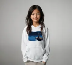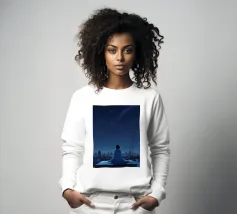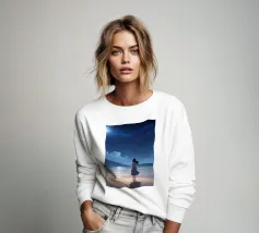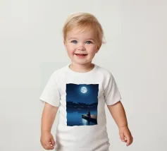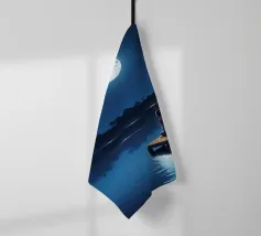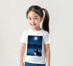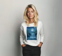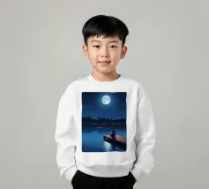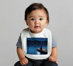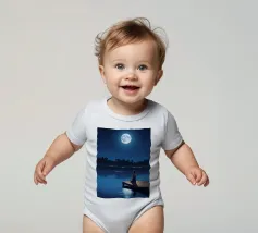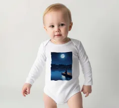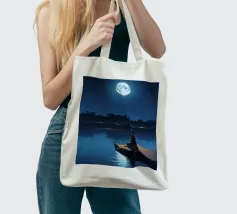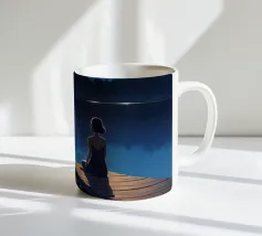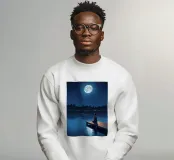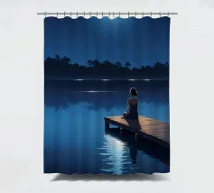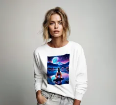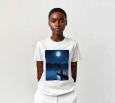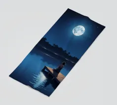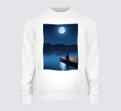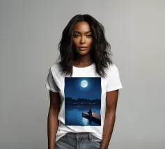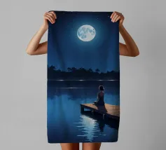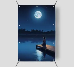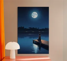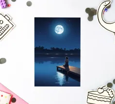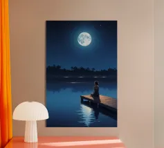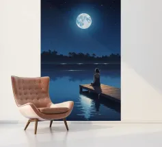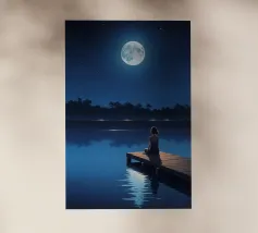 Una scena pacifica sotto una luna piena splendente, mentre una donna siede sul bordo di un molo di legno. I toni freddi e i riflessi delicati creano un profondo senso di quiete.