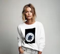 Una scena pacifica sotto una luna piena splendente, mentre una donna siede sul bordo di un molo di legno. I toni freddi e i riflessi delicati creano un profondo senso di quiete.