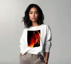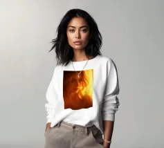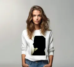Una donna è in posa di profilo, i suoi capelli brillano sottilmente su uno sfondo caldo. La luce soffusa evidenzia i contorni della sua silhouette, creando un'atmosfera calma e sognante.