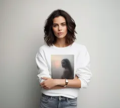 Una donna se ne sta tranquilla con le mani giunte davanti a sé, circondata da un bagliore etereo che ne evidenzia la silhouette nelle serene ore del crepuscolo.