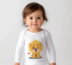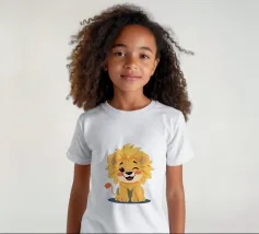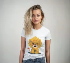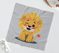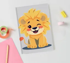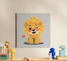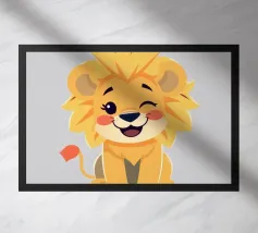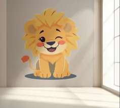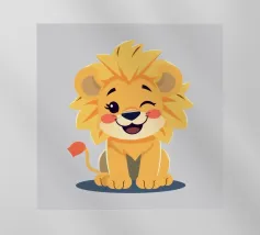 Un allegro leone dei cartoni animati siede con un sorriso amichevole e un occhiolino, mettendo in mostra la sua brillante criniera dorata e la sua soffice coda su un semplice sfondo grigio.