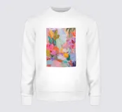 Il motivo mostra una vivace composizione floreale astratta, piena di energia e movimento. Pennellate dinamiche di rosa, arancio e verde si fondono con colori pastello tenui per creare un'arte floreale moderna. La pittura conferisce all'opera profondità e leggerezza estiva.