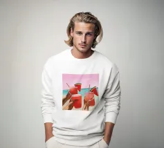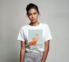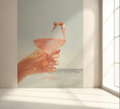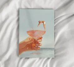 Immaginate: un giorno d'estate, un momento di pura gioia. In questa incantevole opera d'arte, la fantasia si mescola alla realtà in modo giocoso e unico. Una mano regge un bicchiere di bevanda rosa frizzante, pronta a dissetarvi. Ma aspettate: c'è un piccolo tuffatore, pronto a tuffarsi nel bicchiere. Questa scena surreale, incorniciata da un cielo azzurro e da un accenno di oceano, fa sorridere e invita a sognare a occhi aperti.