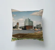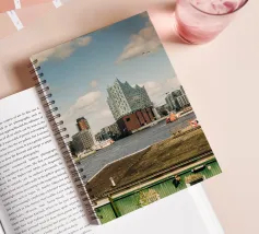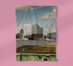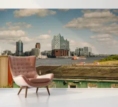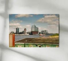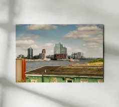Una veduta della famosa sala concerti Elbphilharmonie di Amburgo, catturata in una giornata di sole con una leggera brezza sull'Elba. L'architettura imponente e i traghetti che passano conferiscono all'immagine un'atmosfera vivace e marittima: un pezzo della moderna città anseatica nel bel mezzo della vita quotidiana.