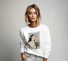 Una donna dai capelli scuri riposa con gli occhi chiusi, parzialmente immersa in una morbida acqua blu. La sua posa è pacifica, il braccio delicatamente drappeggiato sulla superficie. Intorno a lei ci sono grandi tulipani bianchi con accenni di giallo e rosso e un fogliame verde e rigoglioso. Le pennellate strutturate e i toni tenui conferiscono alla composizione una qualità sognante e tranquilla, evocando un senso di calma e introspezione.