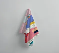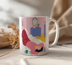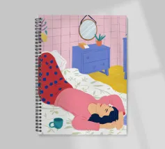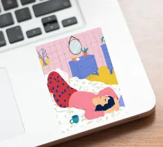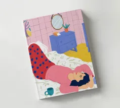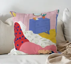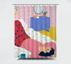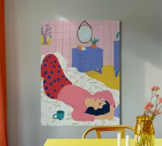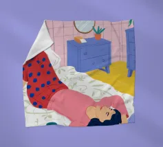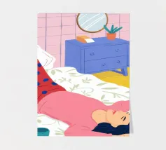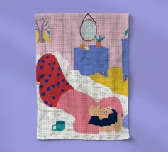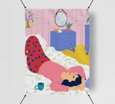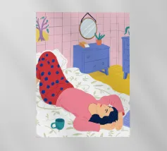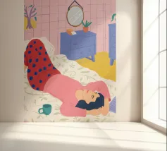 Illustrazione di una donna sdraiata in un letto con lenzuola colorate e a fantasia, che alza lo sguardo pensierosa. La scena, con la sua stanza dettagliata e il riflesso dello specchio, cattura un momento di tranquilla introspezione onirica.