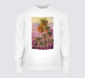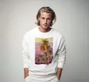 Le alte palme sono immerse nella luce soffusa e sognante di un tramonto pastello, con sfumature rosa e viola che riempiono il cielo e creano una scena tranquilla, nostalgica e tipicamente tropicale.