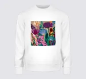 Una giungla densa e psichedelica di foglie e fiori astratti e sovradimensionati, in una palette di colori vibranti e non tradizionali di rosa, viola e blu. L'opera è una fuga massimalista e onirica in una scena di natura fantastica.