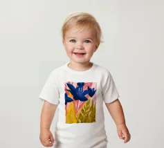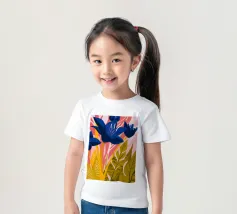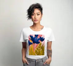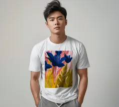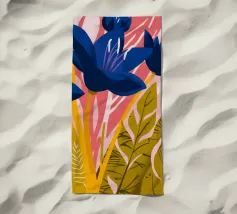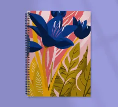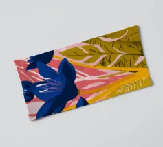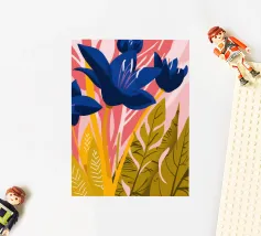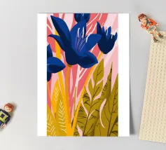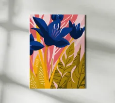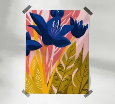 Un'opera d'arte botanica astratta presenta foglie blu cobalto su uno sfondo giallo oro, suggerendo un fogliame sotto un sole brillante in uno stile potente e ad alto contrasto.