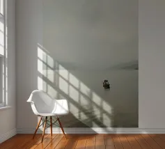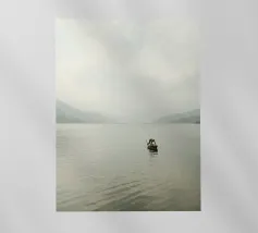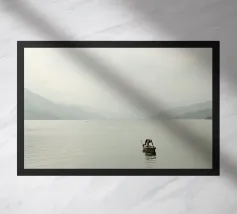 Un pescatore solitario si china sulla sua barca di legno, curando con attenzione la sua rete sulle calme acque del lago Phewa a Pokhara, in Nepal. La vasta distesa d'acqua si estende verso le sagome nebbiose delle montagne sullo sfondo, creando un'atmosfera da sogno. I toni tenui e i morbidi riflessi aggiungono tranquillità alla scena, catturando un momento di vita tranquilla sul lago.