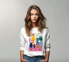 Una scena d'interni mostra una stanza vivace con pareti blu, piante rigogliose e un letto con un'audace coperta zebrata. La composizione è un mix giocoso ed elegante di motivi e colori vivaci, che crea un'atmosfera trendy ed energica.