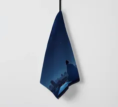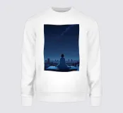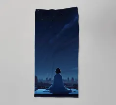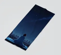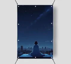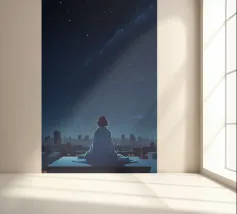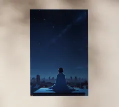 Un'illustrazione calma di una donna avvolta in una coperta, seduta su un tetto a guardare un cielo pieno di stelle e le luci tranquille della città sottostante. Una bella miscela di solitudine, pace e meraviglia.