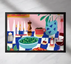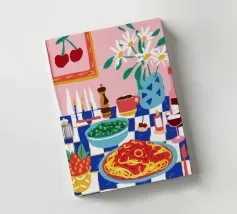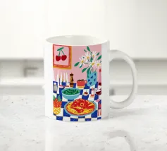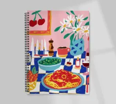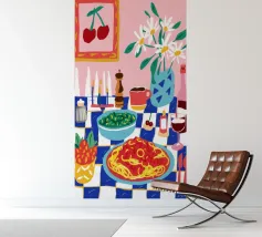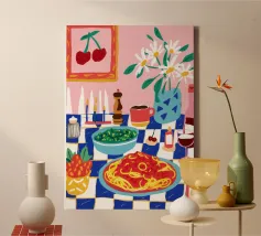 Un'affascinante natura morta di un piatto di spaghetti con ciliegie, accanto a un vaso di gigli bianchi. La composizione è un abbinamento unico, bello e un po' stravagante di un piatto classico e di fiori eleganti.