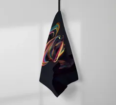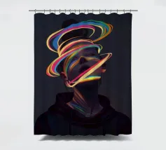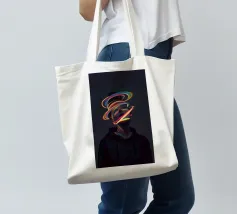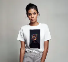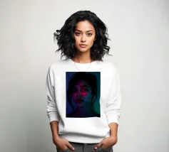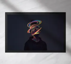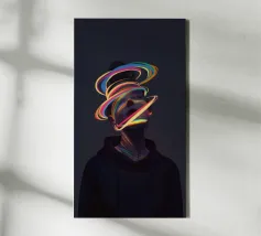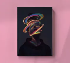 Un'opera d'arte digitale surreale presenta una donna con una felpa scura con cappuccio, il cui volto è illuminato da vibranti scie di luce al neon. I vortici multicolori e incandescenti le avvolgono la testa e il collo, creando un'atmosfera futuristica e onirica.