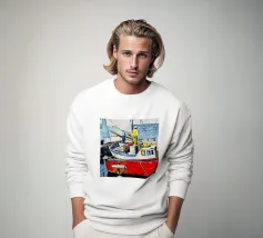 Una scena di porto vivace e colorata, con diversi pescherecci dipinti in rosso, blu e bianco, ordinatamente attraccati lungo un'animata banchina fiancheggiata da edifici costieri.