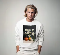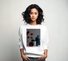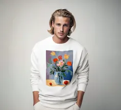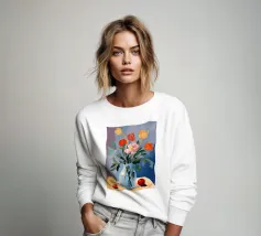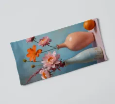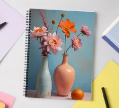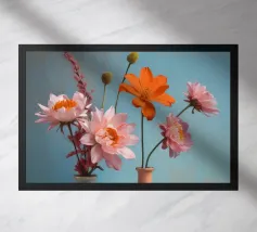 Elegante poster di natura morta con vasi in ceramica dai toni pastello riempiti di fiori sbocciati rosa e arancioni, su un morbido sfondo blu. Perfetto per aggiungere un tocco artistico e sereno agli interni moderni. Ideale per gli amanti dell'arte e dell'arredamento in cerca di ispirazione floreale.