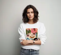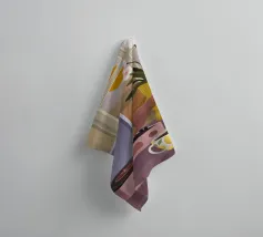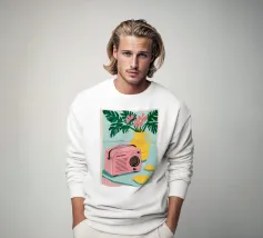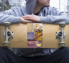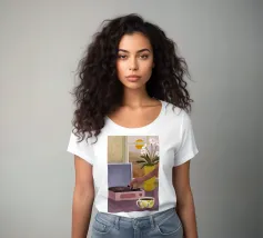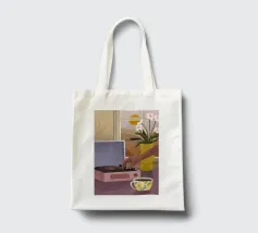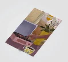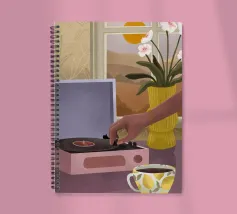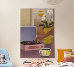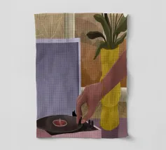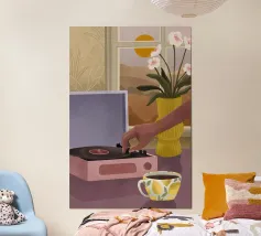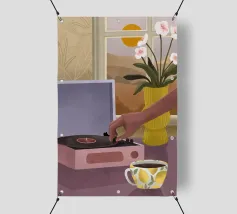 Questa accogliente illustrazione in stile stilistico con colori caldi ritrae una mano umana che suona un disco su un vecchio giradischi. Una tazza di caffè, un vaso di fiori davanti a una finestra con un bel paesaggio completano l'immagine.