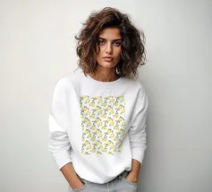 Una bella natura morta di un ramo di limoni in un vaso, su uno sfondo a strisce verticali bianche e blu. La composizione è fresca e classica, con un'atmosfera mediterranea e pulita.