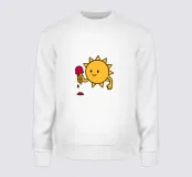 Un sole allegro e sorridente tiene in mano un cono gelato che si sta sciogliendo, con il gelato rosso che cola a terra.