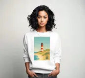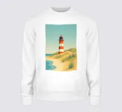 Design minimalista e decorativo di un viaggio estivo con una bella spiaggia e il faro di List-Ost a Sylt. Il tipico faro rosso e bianco che si trova sulle coste del Mare del Nord e del Mar Baltico. Design per vacanze estive per tutti coloro che amano andare in vacanza a Sylt o sulla costa tedesca del Mare del Nord.