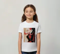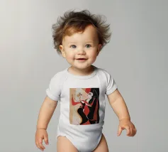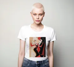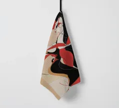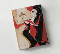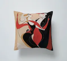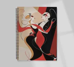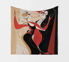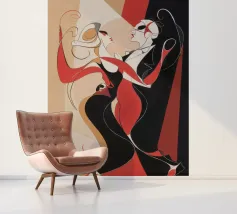 Una coppia di ballerini rossi e neri si abbraccia in un movimento vorticoso, catturando l'energia e l'intimità di un tango appassionato. Le loro forme allungate si piegano con fluida eleganza.